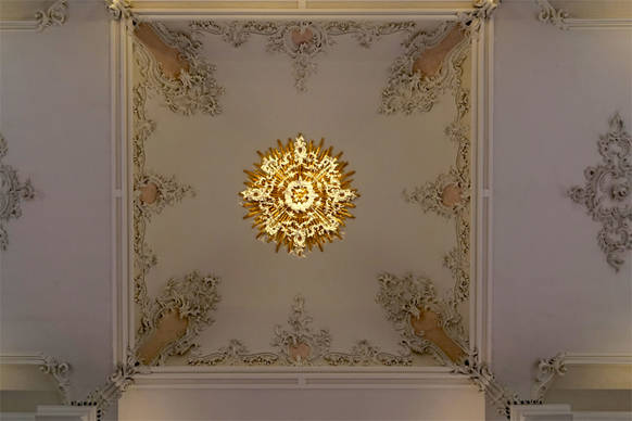Um trotz der großen Höhe die gewünschte lichtgestützte Zonierung erzielen zu können, wählten die Lichtplaner und -ingenieure von luxwerk sehr engstrahlende, bewegliche Strahler, die um projektspezifische Sonderleuchten in Form von Wandleuchten, Strahlern in den Fensterlaibungen und Downlights ergänzt wurden. Insgesamt finden sich im Zentralbau rund 140 Einzelleuchten von luxwerk sowie vier maßgeschneiderte Konstruktionen, die oberhalb der Kapitelle an den vier Ecksäulen im Mittelschiff montiert sind. Jede dieser Kapitell-Lichtinstallationen setzt sich aus jeweils 6 bis 10 Einzelstrahlern zusammen. Darunter sind hochpräzise ausgerichtete LED-Projektoren, die das „Auge Gottes“ aus seitlicher Position im exakten Umriss ausleuchten.