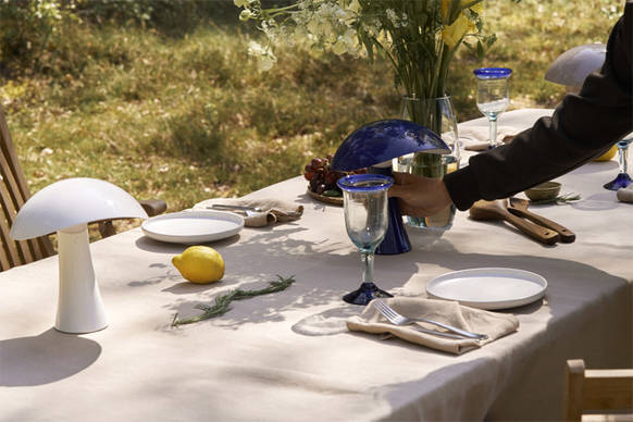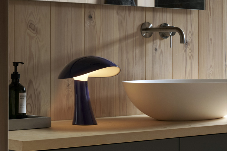 Die Rumee Portable Lamp ist in glänzendem Weiß, warmen Grau und Blau ab November 2025 in ausgewählten Stores sowie auf der Herstellerwebsite erhältlich.