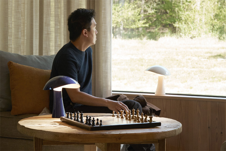 „Ich bin sehr zufrieden mit der Rumee und nutze sie als Leselampe am Nachttisch. Besonders gefällt mir, dass der organische Lampenstab angenehm in der Hand liegt und eine emotionale Qualität hat, die dazu einlädt, seine Form mit den Händen zu erkunden." Gabriel Tan, Louis Poulsen Designer des Jahres 2025.