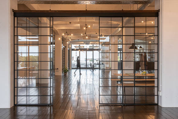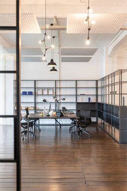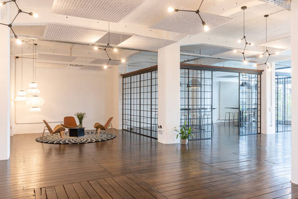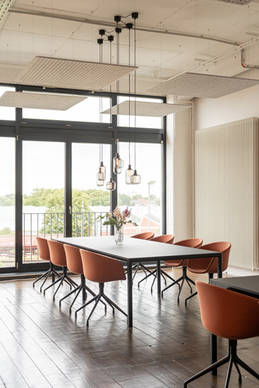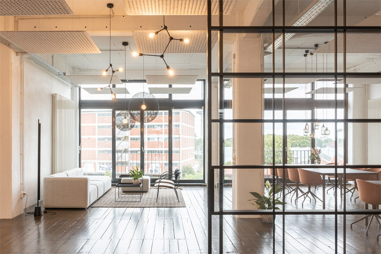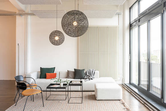 Im denkmalgeschützten Speicher 1 im Bremer Europahafen, der seit Mitte der 2000er Jahre als Büro- und Gewerbelofts genutzt wird, entstand das weitläufige Loft. Es war den Planern wichtig, den ursprünglichen Industriecharme der Räume mit den charakteristischen Betonpfeilern und alten Holzdielen zu erhalten. Farbe und Leichtigkeit bringen Möbel im skandinavischen Stil in den Raum. Lässige Loungebereiche wechseln sich mit Konferenz- und Besprechungszonen ab, in denen wirkungsvoll mit Farbe gespielt wird: in Orange- und Rosttönen setzen einzelne Möbel Akzente, ebenso wie gekonnt inszenierte Leuchten und Lichtskulpturen. Die Konferenzbereiche sind optimal passend durch hochwertige Glasschiebewände mit eingelassenen Sprossen abgetrennt. Diese geben der Konstruktion etwas Minimalistisches und heben den industriellen Look hervor.