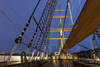 Auf dem Haupt- und Brückendeck der „Peking“ kommen im Bereich der Holz-Nagelbänke Kona Scheinwerfer (24W LED) mit Lichtverteilung oval flood (ca. 20° x 60°) zum Einsatz. Bodenintegriert in den Stahl des Schanzkleids setzen sie das Tauwerk und die Drähte innerhalb der Takelage in Szene. Im Rahmen des Services „ERCO individual“ wurden sie alle in einem rehbraunen Farbton den Nagelbänken angepasst. Entlang der weiß gestrichenen Reling wurden extrem leistungsstarke Kona Scheinwerfer mit 72W LED in Sonder-Gehäusefarbe RAL 9010 (reinweiß) installiert. Mit der Lichtverteilung extra wide flood (80°) illuminieren sie das gesamte Rigg inklusive seiner horizontalen Komponenten auf der Gesamthöhe von rund 50 Metern. Diese Inszenierung mit einer warmweißen Lichtfarbe von 3000K lässt die Aufbauten des historischen Seglers vor dem Nachthimmel wie aus sich selbst heraus in einem gelbgoldenen Ton erstrahlen.