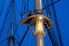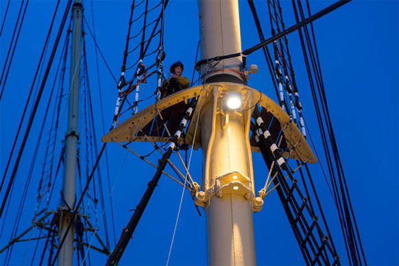 Die Hauptfarben der „Peking“ sind schwarz, weiß, gelb und braun. In dieser Farbskala wurden alle Kona Außenraum-Scheinwerfer, die sich im Bereich des Rumpfes, des Brückendecks und des Riggs befinden, individuell angepasst. Die Leuchten in unterschiedlichen Größen, Leistungsstärken und Lichtverteilungen integrieren sich so perfekt in die Konstruktion des historischen Frachtseglers und treten selbst so wenig wie möglich in Erscheinung. Im gesamten Rigg der „Peking“, das aus vier Masten und insgesamt 18 Rahen besteht, kamen Kona in Ginstergelb zum Einsatz, passend zum gelben Anstrich der Stahlkonstruktion in diesem Bereich. In jedem Mast sitzen vier nach unten strahlende Kona Scheinwerfer (2x48W und 2x24W), die mit der Lichtverteilung flood zur Beleuchtung der offenen Bereiche auf Deck dienen. Jeder Mast verfügt über Plattformen, die sogenannten Salinge. Die drei großen Masten verfügen über jeweils zwei Salinge, der kleinste über einen Saling. Oberhalb jedes Salings sitzen drei Kona Uplights mit jeweils 24W und der Lichtverteilung spot, die die Vertikalen anstrahlen.