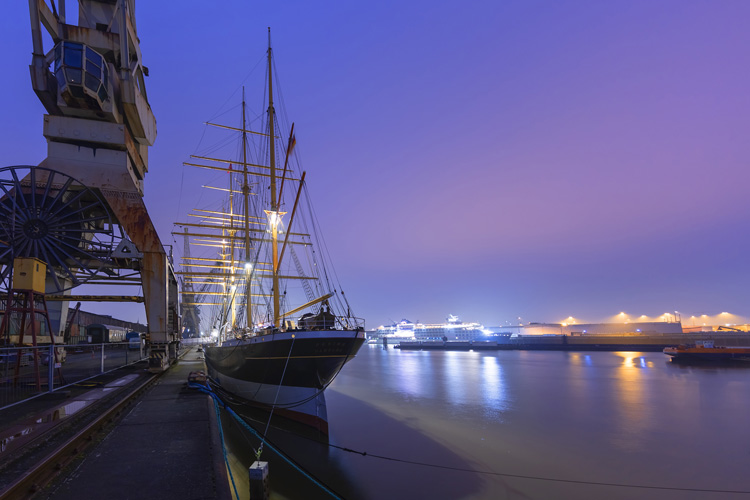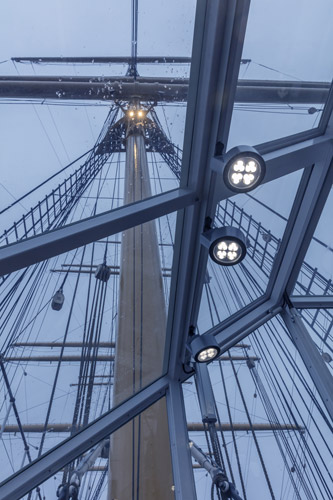 Die „Peking“ wird nie wieder über die Weltmeere segeln, sondern als begehbares Leitobjekt des zukünftigen Deutschen Hafenmuseums vor Anker liegen. Dennoch müssen die Außenleuchten harschen Umwelteinflüssen standhalten. Das spezielle Beschichtungsverfahren von ERCO garantiert eine korrosionsgeschützte Oberfläche, die Wind und Wetter trotzt. Die Scheinwerfer haben die Schutzart IP65, sind also staubdicht und geschützt gegen Strahlwasser aus allen Richtungen. Zudem ist die Langlebigkeit der wartungsfreien LEDs insbesondere in schwer zugänglichen Bereichen wie den Schiffsmasten interessant.