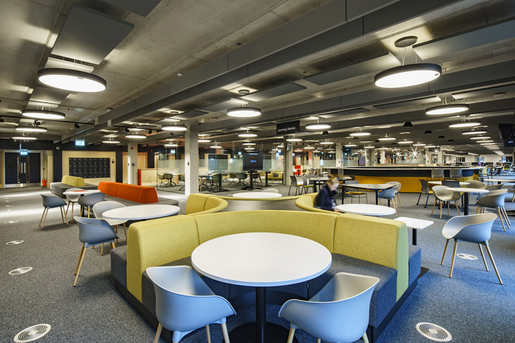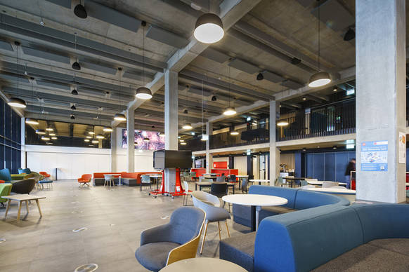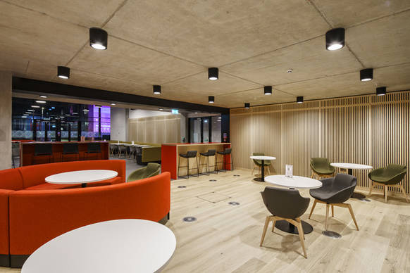 Im Gebäude The Catalyst wurden von Glamox dazu fast 1.900 Leuchten für unterschiedlichste Aufgaben und ästhetische Umgebungen installiert. Für den Außenbereich reichten diese von der wandmontierten, vandalismusgeschützten Leuchte O10 bis zur mastmontierten Leuchte O55 für die Straßen- und Wegebeleuchtung. Die Produkte für den Innenbereich umfassten die Stromschienenstrahler S80 und die eleganten, abgehängten C90-Leuchten. In sozialen Bereichen sorgen die Pendelleuchten SVA mit modernem skandinavischem Design für stilvolle und angenehme Atmosphäre. Individuelle Anpassungen machten es möglich, auch die Notleuchten mit dem Wireless-System zu verbinden und mit einem zentralen Batteriesystem zu versorgen.
