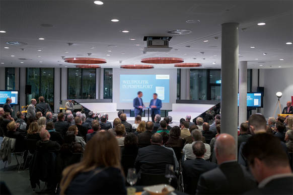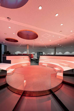 Ein neues Logo spiegelt den digitalen Wandel des Unternehmens mit den drei Standbeinen: Print, Digital und Live. Im Rahmen des Live-Journalismus bietet das Medienhaus deutschlandweit hochkarätige Veranstaltungsformate. Dafür wird mehrmals pro Woche auch die Town Hall in der Düsseldorfer Zentrale genutzt. Dreh- und Angelpunkt ist das sogenannte Forum in Form eines Amphitheaters. Zusammengeschoben kann diese multifunktionale Sitzarena für kleinere Meetings genutzt werden und auseinandergezogen bietet sie Platz für grosse Events. Der hintere Bereich des Raumes dient den Mitarbeitern als Restaurant sowie als Catering für Gäste.