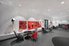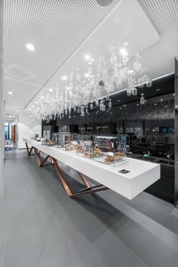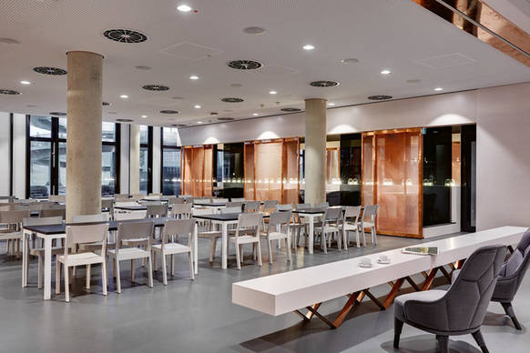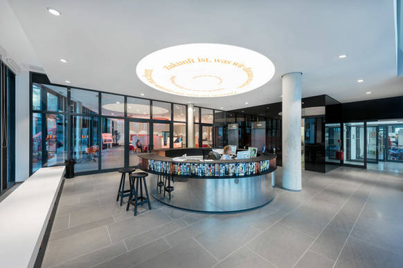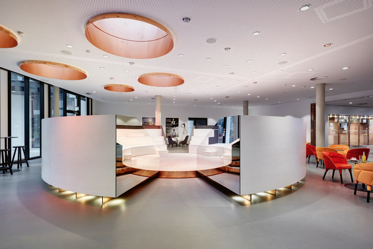 Bei der Raumgestaltung des Bürokomplexes wurden die Wünsche des Hauptmieters umgesetzt. Besonderheiten sind ein grosszügiges Foyer sowie modernste Kommunikations- und Konferenzräume – insbesondere die Town Hall mit Sitzarena, Café-Bar und angeschlossenem Restaurant. Für die Innovationsfreude des Medienhauses steht der Roboter Pepper, der im Foyer die Gäste begrüsst. Er zeigt Raumpläne, erzählt Witze oder macht Tai-Chi-Übungen. Ein Kontakt von Mensch zu Mensch wird am runden Meetingpoint geboten. Überspannt wird dieser von einer Lichtdecke – einer Sonderanfertigung von Regent Lighting in Zusammenarbeit mit Rentex Lichtdecken. Darauf steht das optimistische Motto: „Zukunft ist, was wir daraus machen“ als Symbol für die digitale Transformation mit Blick nach vorne.
