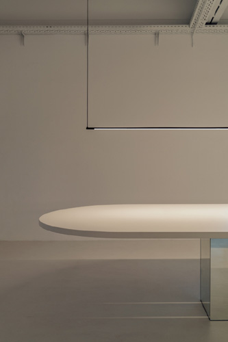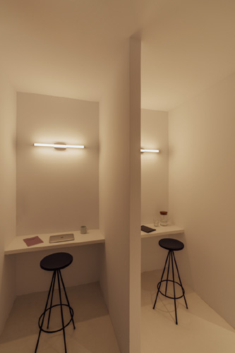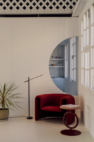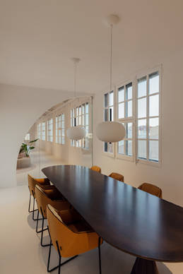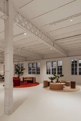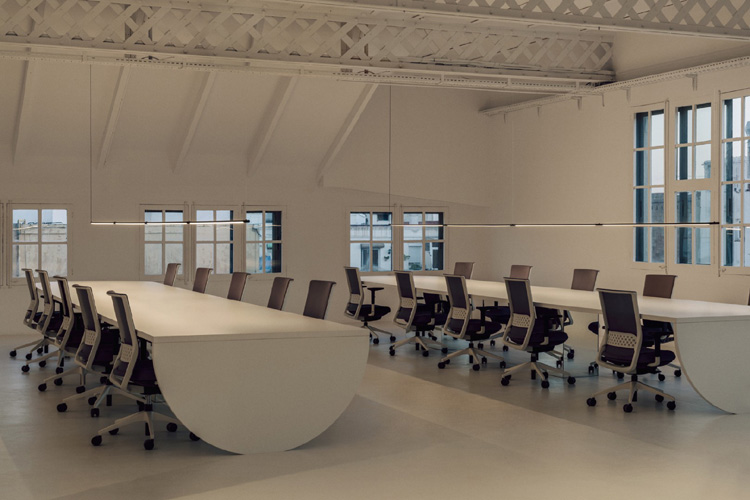 Mit dem Ziel einen offenen Raum für die Kreativität zu schaffen, der gleichzeitig komfortabel ist und zum Lernen und kontinuierlichen Austausch einlädt, hat sich Isern Serra dafür entschieden, die ursprüngliche Struktur des Raumes beizubehalten, jedoch die Arbeitsbereiche offen zu gestalten und kleine Besprechungsinseln zu schaffen. Das Design entzieht sich so dem Glaskasten Stereotyp der Bürowelt. So wurden aus den geschlossenen Räumen kleine Mikroarchitekturen, die miteinander im Dialog stehen. Es entsteht eine skulpturale Landschaft aus Quadern mit kreisförmigen Öffnungen, die wiederum Türen und Fenster bilden, durch die das Licht spielerisch hindurch fällt. Wir fühlen uns in die Welt der Kunst und Schöpfung versetzt. All dies wird durch Farbtöne in Weiß, sanfte Linien und der Wärme des Lichts verstärkt.