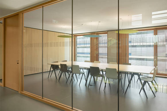 Die Architekten hatten die Absicht, die Farbigkeit der idyllischen Mühlaue, in der das neue Gebäude angesiedelt ist, in den Innenraum zu holen – sanfte, natürliche Töne, die sich positiv auf die räumliche Atmosphäre und damit auch auf die Gesprächskultur auswirken sollen. Dies passte auch zur nachhaltigen Bauweise des Niedrigenergiegebäudes.