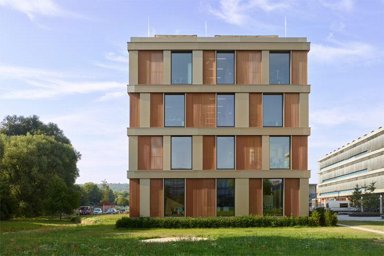 An den „Mühlbachäckern“ in Tübingen ergänzt eine neue Behördeneinrichtung in der Reihe von Verwaltungsgebäuden das räumliche Gefüge. In der idyllischen Umgebung des Mühlbachs erhielt das Landratsamt Tübingen einen Erweiterungsbau. Als Niedrigenergie-Gebäude, das dem KfW-Standard 55 entspricht, ist das Gründach mit einer Photovoltaikanlage ausgestattet.