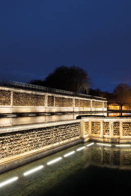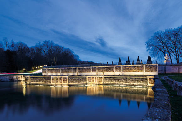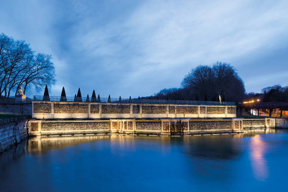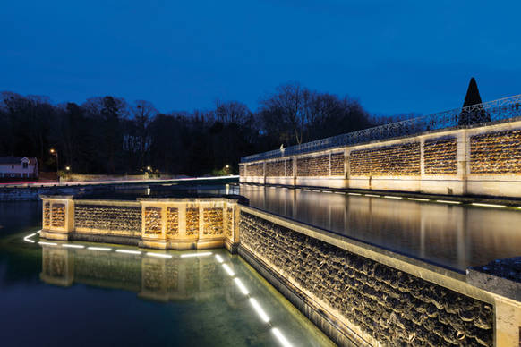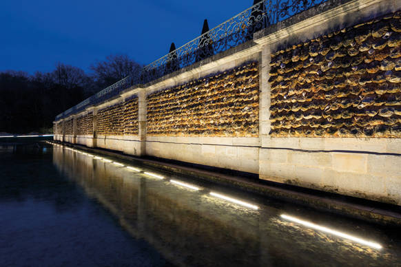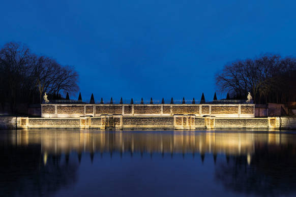 Das Abreuvoir besticht mit seiner für die Architektur des 17. Jahrhunderts typischen massiven und soliden Bauweise, die sowohl der Zeit als auch den Witterungseinflüssen standhalten sollte. Es erstrahlt in einem warmen, weichen und diffusen Licht, das den Baustein umhüllt, sich im Wasser spiegelt und wunderschöne Reflexe erzeugt. Die gesamte beleuchtete Konstruktion steht ebenso im Einklang mit der grandiosen Ästhetik der anderen Gebäude, die unweigerlich mit Versailles und der Herrschaft Ludwigs XIV. in Verbindung gebracht werden, wie mit der natürlichen Umgebung.