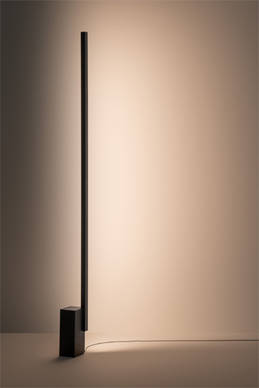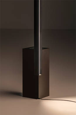 Offset Floor ist mit einem vertikalen Ständer ausgestattet, der aus einem soliden Sockel herausragt und durch ihre Neigung die angrenzende Wand mit einem diffusen Umgebungslicht beleuchtet. Die Kombination mehrerer Leuchten unterschiedlicher Länge verleiht dem Raum eine rhythmische Dimension und die intuitive Beleuchtung, die der natürlichen Entwicklung des Lichts folgt, unterstreicht die minimalistische Form.