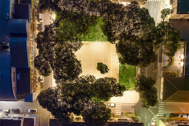 Das Lichtkonzept folgt einer klaren gestalterischen Haltung: Nicht Inszenierung, sondern Zurückhaltung und Präzision standen im Vordergrund. Die Beleuchtung strukturiert den Platz subtil, macht Wege und Aufenthaltsbereiche gut erkennbar und lässt zugleich den prägenden Baumbestand und die architektonische Umgebung bewusst im Vordergrund. Durch die gezielte Ausrichtung der Chameleon-Leuchten wird unnötiges Streulicht vermieden. Das Licht bleibt dort, wo es benötigt wird: auf den Flächen, die genutzt werden. So entstand ein ruhiges, ausgewogenes Nachtbild, das Sicherheit vermittelt, ohne den Ort zu überformen.