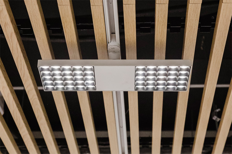 Für das Beleuchtungssystem wurden die Jilly Downlights für Stromschienen von ERCO gewählt. Das flache, rechteckige Gehäuse wirkt elegant und zurückhaltend. Es verfügt über eine hocheffiziente Optik in Kombination mit einem Abblendraster (UGR-Wert 18). Dies gewährleistet eine hohe Lichtleistung und sorgt gleichzeitig für den Sehkomfort der Büromitarbeitenden.