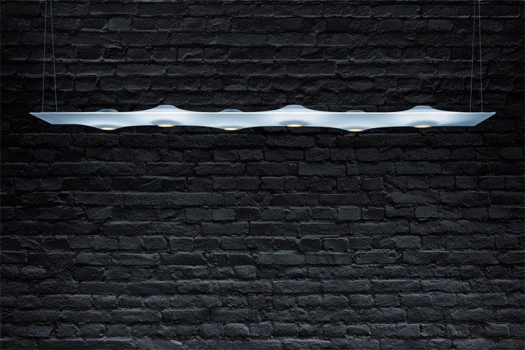 Mit the editions #02 hat Zumtobel bereits zum dritten Mal den Bogen zwischen skulpturalen Raumobjekten und funktionaler Beleuchtung geschlagen. Die Sonderleuchte TEELA ist eine der drei avantgardistischen the editions-Licht-Visionen aus der Feder renommierter Designer und Architekten. Ihr flexibler Stoffmantel spannt sich über den schlanken und flachen Korpus sowie über die leicht herausragenden Spots, die die Oberfläche zur dynamischen Landschaft machen. Das Textil geht mit jeder Ausrichtung der Strahler flexibel mit – und TEELA wird durch eine gleichmäßige Hinterleuchtung zum indirekten Stimmungslicht. Aus der Ferne wirkt die nahezu unsichtbar installierte Pendelleuchte wie eine glimmende, schwebende Wolke. Dabei verbindet sie technologische Raffinesse, akustische Wirksamkeit und einen ausdrucksstarken Charakter mit emotionaler Lichtwirkung. Der besondere und affektive Zugang des Nutzers zum Lichtobjekt war vordergründiges und nachdrückliches Ziel der Gestalter von Delugan Meissl. Sie haben ihre besondere Lichtlösung aus dem Raum heraus und für den Menschen entwickelt – und mit TEELA ein Objekt geschaffen, das jedem Raum eine Aura gibt.
