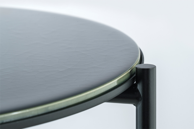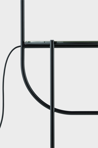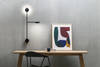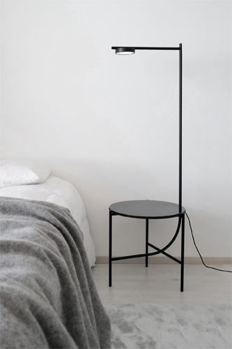 Das Pendant zur Wandleuchte bildet der IGRAM Tisch mit integrierter Stehleuchte. Nach gleichem Prinzip lassen sich Arm und Kopf flexibel um 180 Grad drehen und dadurch das Ambiente anpassen. Auf drei Stahlrohren liegend, wird die handgefertigte Tischplatte in verschiedenen Oberflächen angeboten: gehärtetes Glas, glasierte Keramik oder Eichenholz. Der zudem große Spielraum an Farben lässt ein jedes Produkt zu einem Einzelstück werden.
