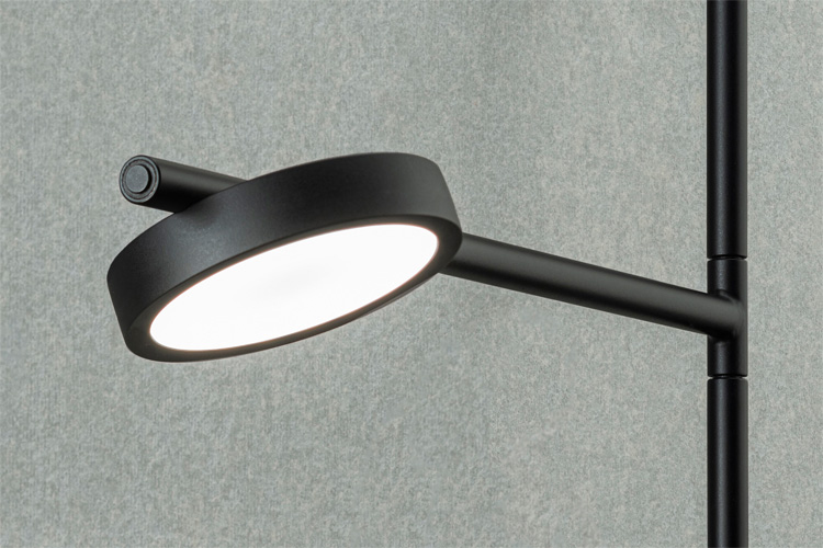 Die beiden Leuchtenköpfe sind mit je 1xLED 5,4W/ 580lm/ 2700K bestückt. Touchdimmer und LED-Treiber sind im horizontalen Arm integriert.
