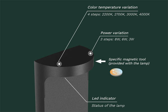 NAIL wird mit einer werkseitigen Standardeinstellung von 3000K – 8W geliefert. Diese Konfiguration kann direkt vor Ort mit dem magnetischen Steuerungszubehör angepasst werden. Auf Anfrage können die Produkte bei Bestellungen von mindestens 10 Einheiten mit verschiedenen Leistungs- und Farbtemperaturkombinationen vorkonfiguriert werden, wobei weitere Anpassungen vor Ort weiterhin möglich sind.