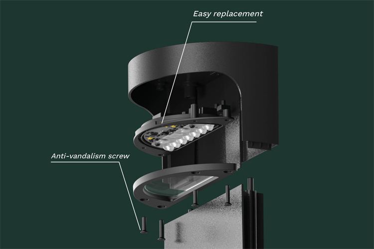 Dank seines modularen Designs kann das LED-Modul schnell ausgetauscht werden, was die Betriebskontinuität und eine einfache Wartung gewährleistet. NAIL kombiniert modernste Technologie mit elegantem Design, um außergewöhnliche Leistung und Stil zu bieten. Die asymmetrische Optik sorgt für eine fokussierte Bodenbeleuchtung und schafft so sicherere und gut ausgeleuchtete Räume. Dank der strukturierten Optik sind die LED-Punkte perfekt verborgen und sorgen für ein gleichmäßiges, blendfreies Licht für verbesserten Sehkomfort. Das nahtlose Frontdesign sorgt für ein modernes und klares Erscheinungsbild und wertet jede Außenumgebung elegant auf.