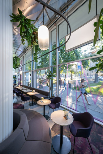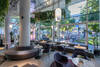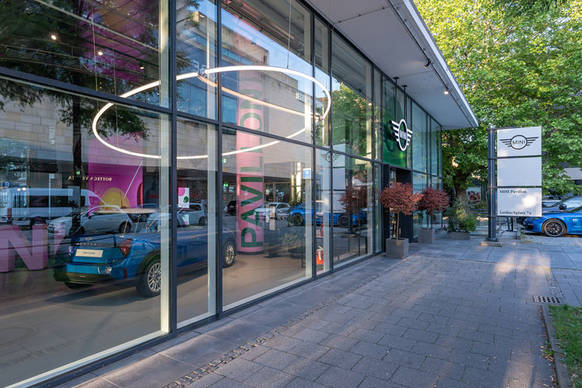 Welcome to the Jungle - Mit der Umgestaltung des MINI Pavillons hat BMW einen ungewöhnlichen Begegnungsort geschaffen: In Kooperation mit mehreren Partnern ist ein Shared Space entstanden, der für ein urbanes, dynamisches Lebensgefühl steht. Zusätzlich zu den ausgestellten Fahrzeugen beinhaltet er einen Barbershop, einen Co- Working-Space und ein Café – und eignet sich damit bestens zum Shoppen, Netzwerken und Entspannen. Wichtige Eigenschaft der Neugestaltung sind die vielen Farbnuancen des Interieurs von dunklem Grün über Grau bis hin zu Lila und Rosa. Die Decke ist mit silbern schimmernden Platten verkleidet, die der Innenarchitektur eine retrofuturistische Komponente verleihen. Besonders auffällig sind die zahlreichen Pflanzen, die besonders im Café, aber auch im übrigen Pavillon zu finden sind: Am Boden und in der Höhe wachsen Tropenpflanzen wie Calatea und Lyrata, wuchern Farne kopfüber von Deckengehängen wie im Dschungel – und sorgen so für ein biophiles, lebendiges Ambiente.