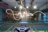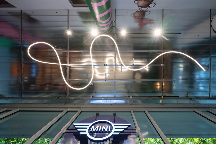 Im Eingang zum Ausstellungsraum hängt La Linea als gewundene Lichtskulptur unter der silbernen Decke, von der sie verwaschen gespiegelt wird. Der ebenfalls von der Bjarke Ingels Group (BIG) entworfene, ausdrucksstarke Lichtschlauch scheint elegant in der Luft zu schweben. Dank der patentierten Optik erzeugt der extrem biegefähige Schlauch ein absolut gleichmäßiges und angenehmes Streulicht mit hohem Wirkungsgrad. La Linea folgt der Architektur und lässt Innen- und Außenbereiche verschmelzen, denn aufgrund ihrer Materialeigenschaften trotzt sie auch extremen klimatischen Bedingungen. Diese Eigenschaften machen den Lichtring La Linea Back Bone möglich, der als absoluter Hingucker vom Innenraum durch die verglaste Außenfassade spektakulär ins Freie ragt. Ein Aluminiumprofil verleiht dem Lichtschlauch hierbei die nötige Stabilität.