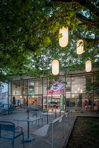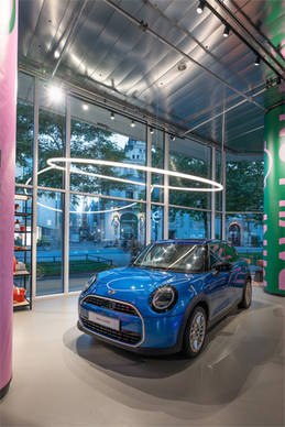 Die Lichtgestaltung erfolgte in Absprache mit MINI München und dem Lichtplaner Oswin Nikolaus: Der Besuch der MINI-Showrooms soll zu einer emotionalen, ästhetisch reichhaltigen Erfahrung werden, die sich am ganzheitlichen Wohlfühlansatz der Premiumhotellerie orientiert. Die ausgewählten Artemide Leuchten verbinden konzentriertes Licht für die Fahrzeugpräsentation und prägnante Designs mit einer warmen, gemütlichen Lichtstimmung in den Lounge- und Hospitalitybereichen. „Wir haben jeden einzelnen Bereich – oder Touchpoint, wie wir es nennen – gesondert betrachtet, um seine Eigendynamik zu erfassen und die passende Lichtstimmung zu ermitteln“, erläutert der Münchner Lichtdesigner Oswin Nikolaus, der das Beleuchtungskonzept für den MINI Pavillon interpretierte und an die spezifischen architektonischen Verhältnisse vor Ort anpasste. Die verschiedenen Zonen wurden dabei konsequent aufeinander abgestimmt und zu einem ausgewogenen Lichtgefüge verbunden.