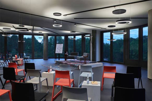 Für den multifunktionalen Meet & Move Room gab es eine zusätzliche Anforderung an das Lichtplanerteam von Occhio, die zu einer Leuchten-Sonderlösung führte: Mito soffitto wird hier mit akustisch wirksamem Material in Form von runden, schwarzen Paneelen aus PET eingesetzt, die im Material die vorhandenen Stellwände von Design Offices aufgreifen. Diese Sonderlösung kombiniert erstmals Licht und Akustik in einer Occhio-Leuchte, die als Mito soffitto acoustic in abgewandelter Form in das Portfolio aufgenommen werden wird.