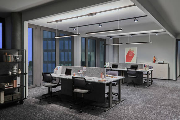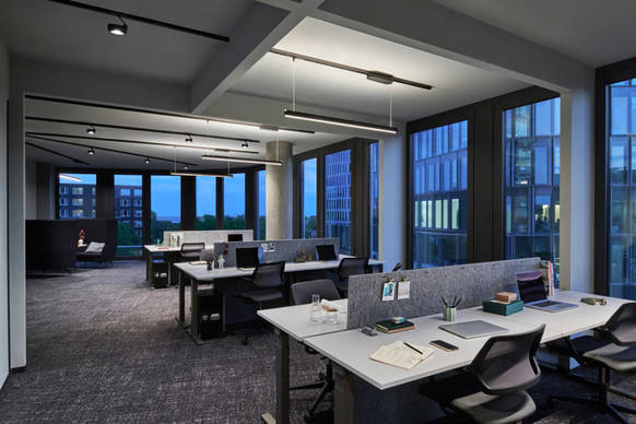 In den Regelgeschossen kommt die hohe Flexibilität des Lichtkonzepts ein weiters Mal ins Spiel und gewährleistet einen großzügigen Individualisierungsgrad. Hier setzt sich das Rastersystem durch alle Bereiche konsequent fort, bestückt alternierend mit jeweils drei Più R alto 3d Strahlern und einer Pendelleuchte – Mito volo track. Das Layout der Lichtschienen korrespondiert dabei eng mit der Architektur: Einerseits wurde auf die Fensterachsen eingegangen, zum anderen wurden alle Unterzüge, die optional für Zwischenwände genutzt werden können, miteinbezogen.