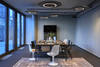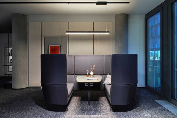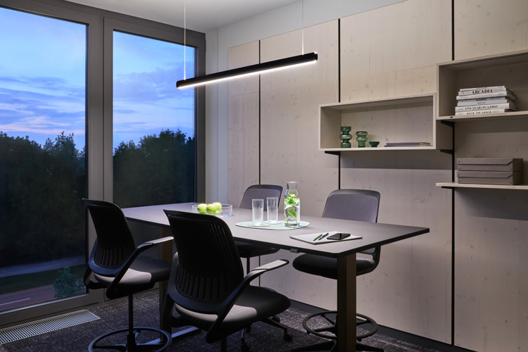 Die kleinste Office-Einheit fungiert als Einzel-, Zweierbüro oder Besprechungsraum für vier Personen. Es ist mit zwei Schienen – einmal mit Pendelleuchte und einmal mit Strahlern – ausgestattet. Mit diesem Format offenbart sich die Flexibilität beider Komponenten, Architektur und Lichtkonzept, am deutlichsten: flexible Stellwände einerseits, die den Großraum zu Mini-Büros werden lassen und das konsequent durchkomponierte Schienenraster mit Leuchten von Occhio. Auch hier ergänzt das punktuelle, gerichtete Licht die nach oben abstrahlende diffuse Komponente der Pendelleuchte.