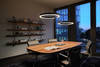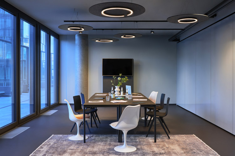 In den sehr hochwertig ausgestatteten und wohnlich anmutenden Besprechungsräumen, die mit bekannten, sorgfältig ausgewählten Designklassikern möbliert sind, setzt sich die angedeutete Verspieltheit in der Beleuchtung fort. Mito sospeso inszeniert einen einladenden Treffpunkt, der zusammenbringt, verbindet und eint. Ihr Licht lässt sich in seiner Farbtemperatur situativ abstimmen – von anregendem Licht am Morgen bis hin zu warmem Licht für entspanntes Networking. Meetings erfahren so eine vertraute und persönlichere Atmosphäre.