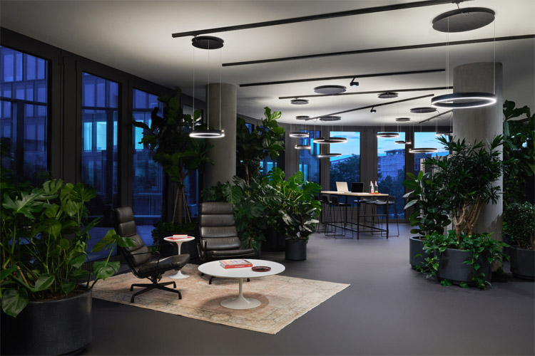 In der zweiten Etage befindet sich der Empfang. Hier kommen Menschen zusammen – Loungebereich, Cafébar und eine große Außenterrasse laden zum kreativen, lockeren Austausch ein. Für dieses Szenario wünschte sich Design Offices eine Beleuchtung, die konzeptionell von der repetitiven Kontinuität der Regelgeschosse darüber abweicht. Dennoch kommen hier dieselben Leuchten zum Einsatz, die das gesamte Projekt begleiten: der Strahler Più R alto 3d als Schienenversion und eine Sonderversion der Pendelleuchte Mito sospeso mit schwarzem Baldachin. Die Lebendigkeit durch unterschiedliche Höhen und die lose Anordnung erzeugen optische Leichtigkeit, die für die gesamte zweite Etage signifikant ist.