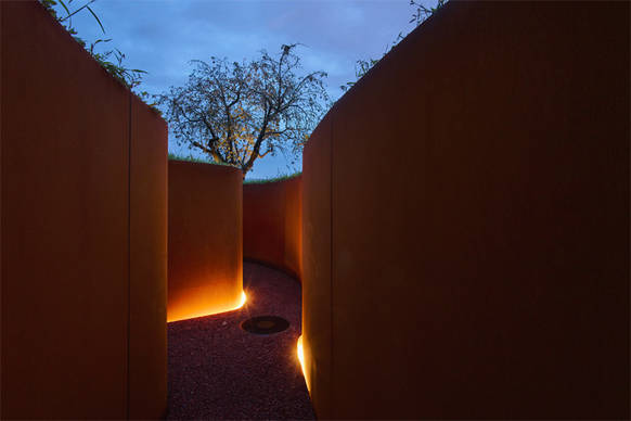 Die Besucher werden behutsam durch verdeckt platzierte Lichtlinien, die in unregelmäßigem Rhythmus angeordnet sind, in Richtung Gongraum hinabgeführt. An den sieben Knotenpunkten, die symbolisch für die Chakren stehen, verjüngen und verbreitern sich Boomerang-förmige, in den Boden eingelassene Details, die den Bewegungsrhythmus bestimmen und das Erlebnis der Erkundung vertiefen. Die 2.200 K-Beleuchtung harmoniert mit der Wärme des Cortenstahls und entwickelt einen sanften bernsteinfarbenen Schimmer, der das an die Dunkelheit gewöhnte Auge entspannt. Die Lichtbänder sorgen für eine angenehme Orientierung ohne visuelle Ablenkung und ermöglichen dem Besucher dadurch seine vollständige Konzentration auf Einkehr und Besinnung.