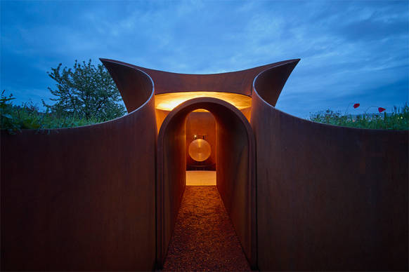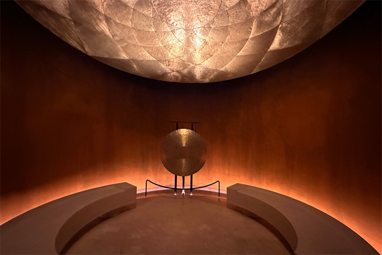 Die Reise endet im Gongraum, wo Licht und Klang zusammenfinden. Ein linearer Lichtschein umrandet den kreisförmigen Rand der Kammer, während unsichtbar platzierte Projektoren den Raum beleuchten. Die Besucher nehmen nur ein geheimnisvolles Leuchten wahr, das von einer Messingdecke reflektiert wird, die im Einklang mit dem meditativen Ton des Gongs schimmert. Gleichzeitig umschließt die Decke die Kammer nur teilweise und lässt Licht, Luft und Niederschlag herein. Die Beleuchtung geht hier weit über ihre funktionale Rolle hinaus und wird zu einem Instrument der Selbstreflexion und Transzendenz.