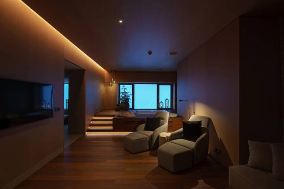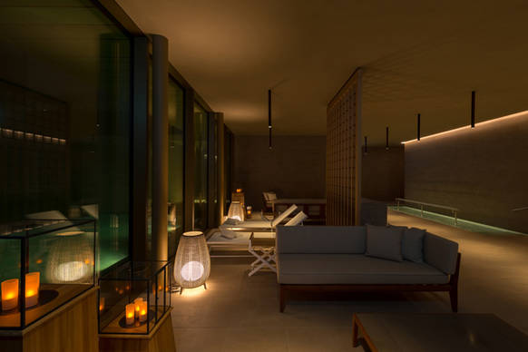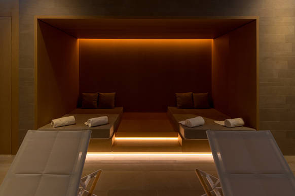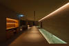 “Vor allem im Bereich der Saunen soll eine indirekte Beleuchtung über Lichtvouten und integrierte Lichtelemente den Gästen einen möglichst großen Komfort bieten“, erläutert Martina Weiss die Bedeutung eines sanften und warmtonigen Lichts für eine harmonische und beruhigende Kulisse im Spa. Für die zahlreichen Kalt- und Warmwasserbecken wurde ein speziell für das Projekt entwickeltes, aufwendiges Stufendetail mit integrierter Beleuchtung realisiert. Vor allem die Dichtigkeit und Chlorwasser-Resistenz stellten eine große Herausforderung dar.