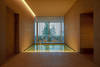 Eine Verbindungstreppe führt hinunter zur Saunalandschaft mit Kalt- und Warmbecken sowie den Ruheräumen. Eine plätschernde Wasserwand begleitet die Treppe und erzeugt ein reizvolles Lichtspiel, indem sie über engstrahlende Aufbauleuchten in Szene gesetzt wird.