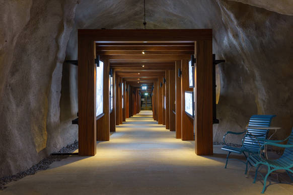 Der Gast betritt das Spa zunächst über einen Tunnel, der sich tief in den Berg gräbt und auf dem Weg hindurch einlädt, die Historie des Resorts und der Umgebung in einer Wechselausstellung kennenzulernen. Die Beleuchtung der seitlich flankierenden Vitrinen erfolgt zum einen integriert, zum anderen über Strahler. Neben der Ausstellungsbeleuchtung entlang der Tunnelwände weisen druckvolle Lichtpunkte auf dem Tunnelboden den Weg in Richtung Aufzüge, welche den Gast in die Welt des Spas in den darüberliegenden Geschossen bringen.