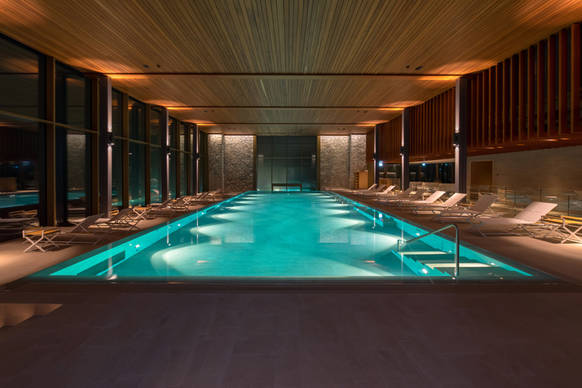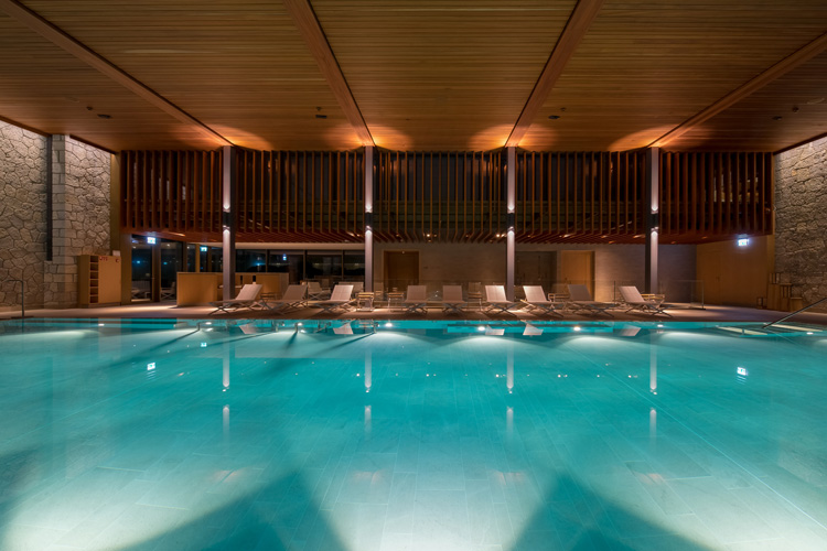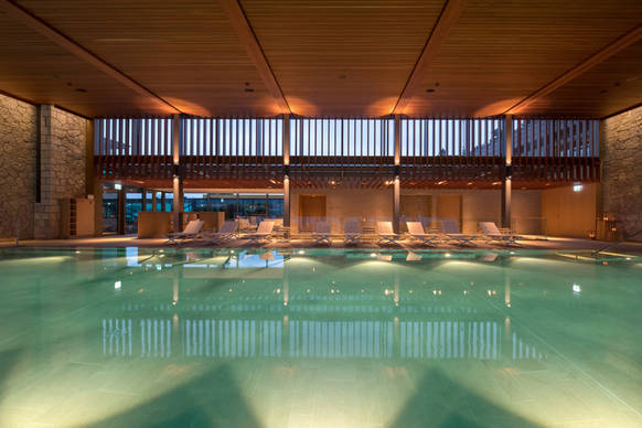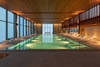 Über einen Empfangsbereich und die Umkleiden gelangt der Gast in das Herzstück des Alpine Spas – den Indoor-Pool. Der großzügige Raum wird tagsüber üppig mit vitalem Tages- und Sonnenlicht geflutet.