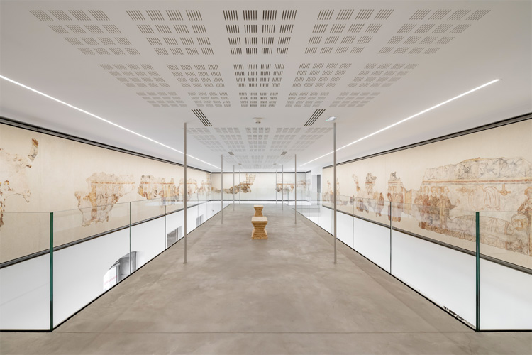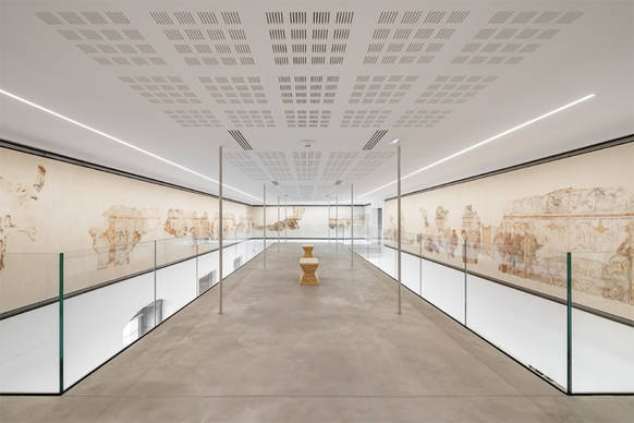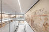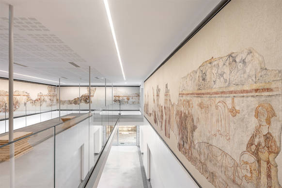 Das Galeriegeschoss über dem Shop- und Eingangsbereich weist eine ganz ähnliche Gestaltungssprache mit klaren und puristischen Elementen auf. Die ausgestellten „Peintures murales de Cruet“ zeigen beeindruckende Wandmalereien aus dem Mittelalter, die von umlaufenden Wallwashern in der Decke wirkungsvoll in Szene gesetzt werden und den Eindruck eines zusammengehörigen Gesamtkunstwerkes vermitteln. In den vier Raumecken haben die Lichtplaner separate Steuergruppen eingesetzt, um durch eine angepasste Dimmung parabolische Lichtabbildungen an den Stirnseiten zu vermeiden und eine möglichst homogene Ausleuchtung des Raumes zu gewährleisten.
