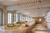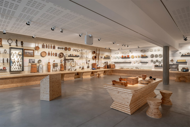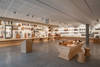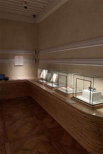 Nachdem der Eingang in der Vergangenheit ursprünglich auf der gegenüberliegenden Seite des Museums lag, ist er nun unauffälliger neben der prächtigen Franziskaner-Kathedrale platziert. Die Fassade fügt sich harmonisch in die historischen Gebäudekonstellationen ein und die Besucher werden im Eingangsbereich von einem lichtdurchfluteten, zweigeschossigen Raum in Empfang genommen. Hier ist neben dem Ticketverkauf auch der Shop untergebracht. Warm wirkende Holzmöbel in Kombination mit einer minimalistischen Gestaltung der Wände und Decken schaffen Modernität inmitten eines historischen Gebäudes. Durch die allgemein helle Farbgebung wird eine angenehme Weite und Großzügigkeit vermittelt, die den Besucher bei einem Blick ins offene Obergeschoss bereits erste Exponate wahrnehmen lässt. Lineare LED-Profile, die in rhythmisch angeordneten Deckenvouten verortet sind, sorgen zusammen mit ausrichtbaren Strahlern für eine funktionale sowie akzentuierte Beleuchtung. Gleichzeitig bilden sie mit der akustisch wirksamen perforierten Gipskartondecke ein stimmiges und ruhiges Deckenbild.