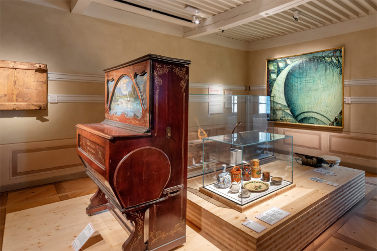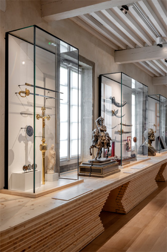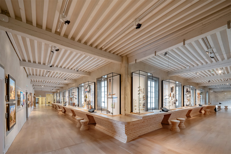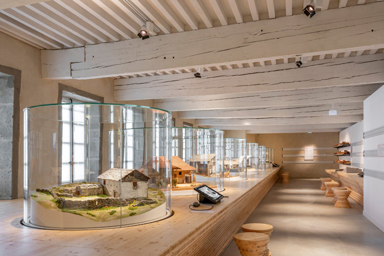 In beiden Obergeschossen wurden einheitliche Strahler mit einer Lichtfarbe von 3.000 K eingesetzt. Die Ausstrahlwinkel sind mittels Drehfokussierung veränderbar, und die Strahler sind mit Abblendkappen kombinierbar, um einerseits die sehr unterschiedlichen Exponate zu beleuchten und andererseits eine ungewünschte Lichtstreuung bzw. Blendung zu vermeiden. Auch im 2. Obergeschoss liegt ein Teil der Ausstellungsräume am Kreuzgang mit Außenraumbezug, während die innenliegenden Bereiche von einem präzisen Kunstlicht profitieren. Gläserne Vitrinen entlang der Fenster präsentieren die vielseitigen Exponate und werden von gegenüberliegenden Kunstwerken ergänzt. Die Strahler sind an Stromschienen im Horizont einer Holzrippendecke platziert und akzentuieren die Gegenstände und Gemälde individuell. In den innenliegenden, abgedunkelten Bereichen werden die Besucher nicht nur zum Anschauen der Exponate, sondern auch zur Interaktion eingeladen, da einige Objekte sogar angefasst werden können und die Möglichkeit geben, in die Welt der Bevölkerung der Savoie und seiner Lebensumstände einzutauchen.