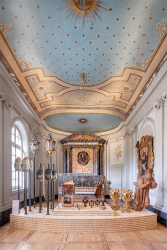 Ein besonderes Highlight ist die Kapelle im 2. Obergeschoss der Dauerausstellung. Die sakrale Anmutung der Architektur wird durch religiöse Objekte ergänzt und bietet ein außergewöhnliches Raumerlebnis innerhalb des Museums. Insbesondere die Decke der Kapelle ist ein für sich stehendes Kunstwerk und wird von einer auf den flankierenden Gesimsen verorteten Indirektbeleuchtung sanft eingeblendet. Justierbare Strahler sind auf dem Sims platziert und heben sowohl den prächtigen Altar als auch weitere Exponate auf einem hölzernen Podium hervor. Aufgrund der unebenen Beschaffenheit der Corniche in der Raumapsis, konnte hier keine unsichtbar montierte Indirektbeleuchtung realisiert werden. Stattdessen übernehmen die vorgenannten Strahler die Ausleuchtung der Gewölbekappe.