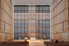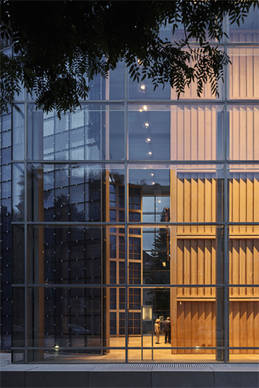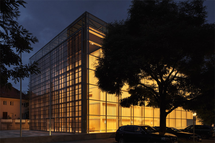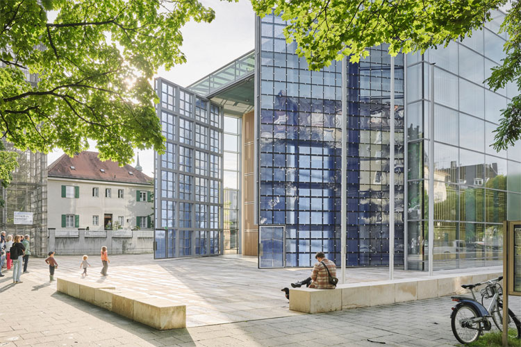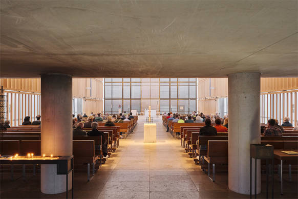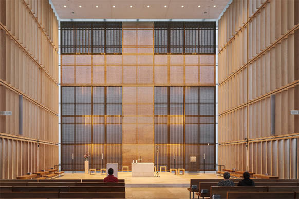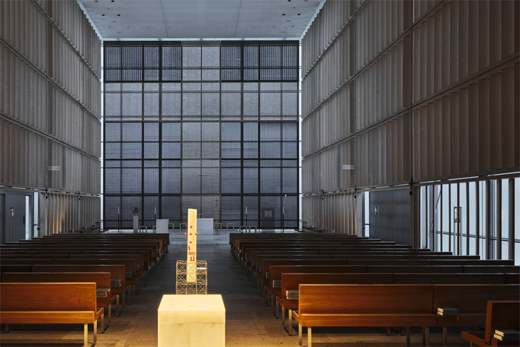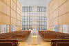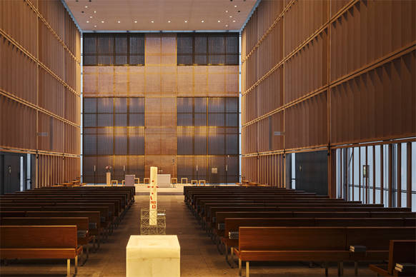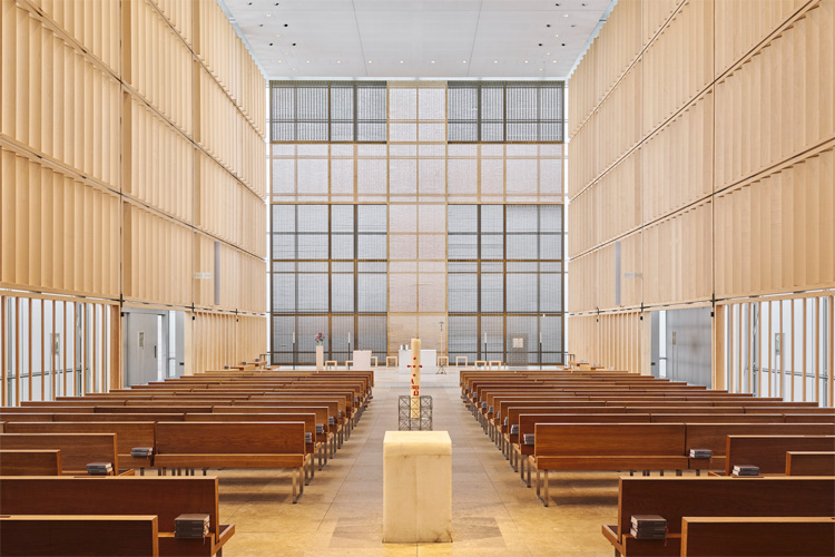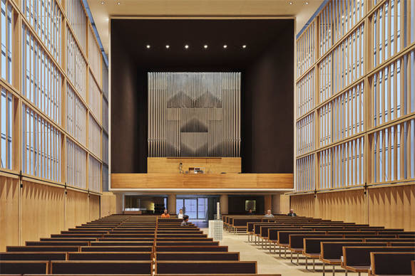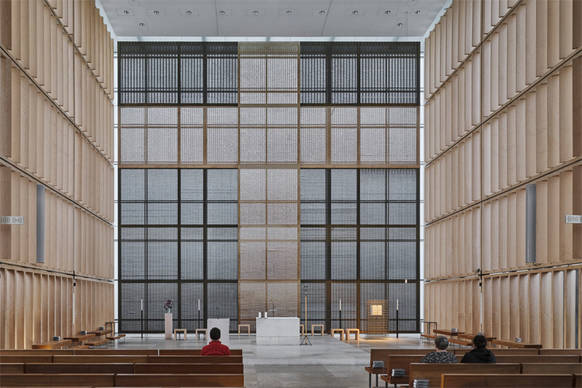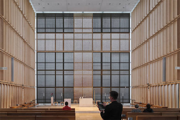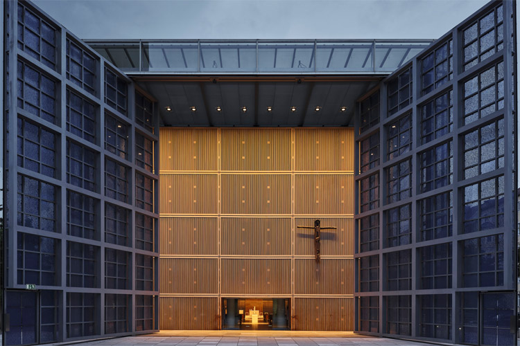 Eine Aussage, die immer noch so treffend ist wie vor 25 Jahren. Heute ist die Herz-Jesu-Kirche im Münchner Stadtteil Neuhausen in erster Linie das Zentrum einer lebendigen Kirchengemeinde, das reichhaltige Konzertprogramm lockt viele Kulturinteressierte aus München und Umland. Aber sie ist zugleich Pilgerort für Architektur-Aficionados und mit dem Superlativ des „größten Kirchenportals der Welt“ eine veritable Touristenattraktion. Sie alle treffen auf einen schlichten, kubischen Baukörper aus Stahl und Glas, der einen eingestellten Quader aus Holz – den eigentlichen Kirchenraum – schützend umhüllt. Die beiden Schichten filtern das Tageslicht auf unterschiedliche Weise: Während die Glasfassade mit einem Verlauf von Mattierung das Licht im Inneren von klar zu diffus verändert, öffnen sich die Lamellen des hölzernen Innenraums zum Altar hin, sodass die Helligkeit auf dem Weg durch die Kirche zunimmt. Das Kunstlichtkonzept kehrt diese Wirkungen bei Dunkelheit um und macht das Gotteshaus zu einem schimmernden „Bergkristall“, wie die Architekten formulierten.