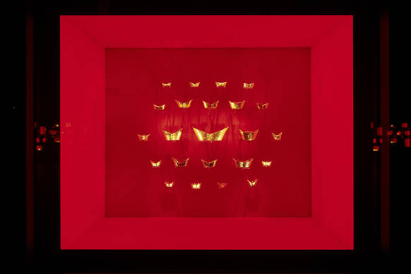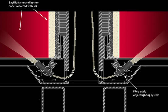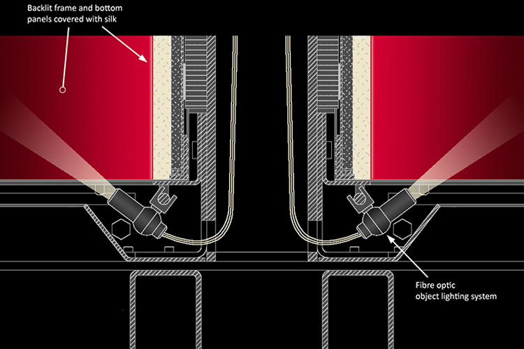 Das "Raumlicht" wird in jeder Vitrine durch hinterleuchtete Seitenwände erzeugt. Gleichmäßig diffus abstrahlende und mit roter Seide bespannte LED-Paneele erhellen jede Vitrine von vier Seiten (Silk Light). Sie erzeugen eine magische Atmosphäre und sanfte Grundhelligkeit, die jede Vitrine einzeln und alle Vitrinen gesamthaft zu einem hochwertigen visuellen Erlebnis werden lassen. Die warmweiße Lichtfarbe (3.000°K) betont die Farbwerte der Seide und des Goldes. Zugunsten eines höheren Kontrasts und einer optimalen Lesbarkeit der Objekte wurde auf die Hinterleuchtung der Rückwand verzichtet. Eine große Qualität des Raumlichts ist es, dass es vom Betrachter nur unbewusst wahrgenommen wird, denn die flachen LED-Paneele sind als Lichtquellen kaum zu erkennen. Sowohl der Boden als auch der "Rahmen" (bestehend aus Decke und den Seitenwänden) sind getrennt schalt- und dimmbar.