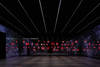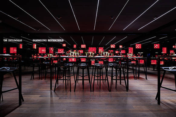 Angesichts der beschriebenen Parameter sollte sich die Lichttechnik soweit wie möglich zurücknehmen. Zwei minimalistische, stark blendungsbegrenzte Systeme dienen dabei unterschiedlichen Zwecken: sehr schmale LED-Lichtlinien mit Blendschutzraster in Sonderanfertigung liegen leicht zurückgesetzt in den Fugen der Metall-Kassettendecke. Sie sind dimmbar und dienen der dezenten, weichen Aufhellung des Raumes im Museums-betrieb, ohne die Präsentation der Sammlung oder die Medienbespielung zu stören.