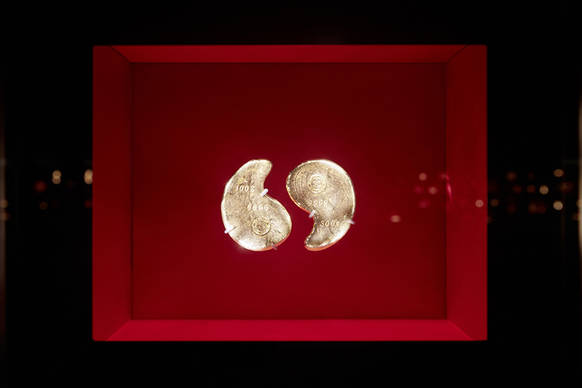 Das "Objektlicht" setzt das Gold in Szene. Ein vierseitig unsichtbar integriertes System aus Miniatur-Strahlern illuminiert die Exponate mit warmweißen Licht. Sie sind präzise justierbar, mit unterschiedlichen Optiken ausgestattet und werden durch ein faseroptisches System gespeist, das je Vitrine nur einen Projektor mit einer LED-Lichtquelle benötigt. In jeder Vitrine wurden zwischen 12 und 28 dieser Lichtköpfe mit zwei unterschiedlichen Ausstrahlungswinkeln ( 5° und 10°) verwendet, um die zum Teil hochkomplexen Arrangements liegender oder schwebender Exponate wirkungsvoll zu inszenieren. Die Integration und Detaillierung der faseroptischen Systeme bildete die Basis für die Planung der Vitrinen und wurde anhand von 1:1-Modellen getestet. Den Lichtplanern war es wichtig, dass weder sichtbare Lichtköpfe noch Blendpunkte den Einblick in die Vitrinen und die Betrachtung der Exponate stören.