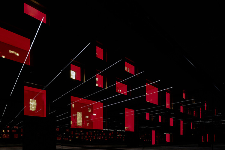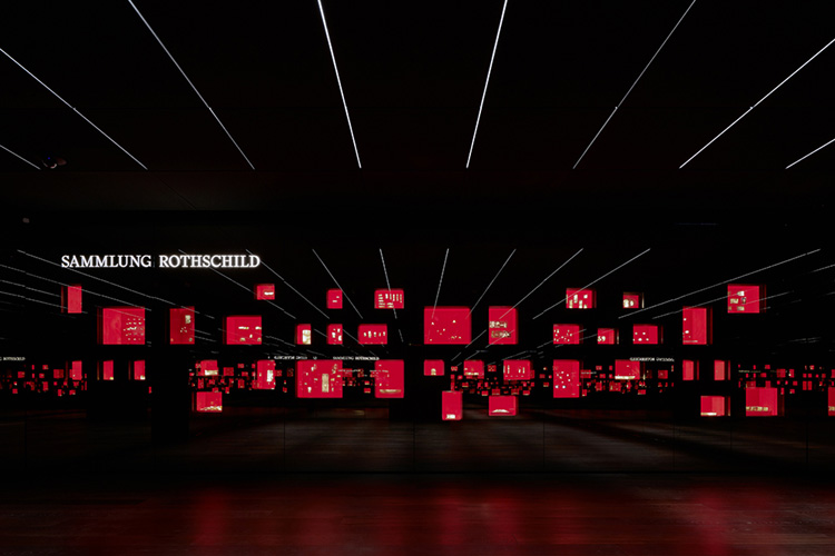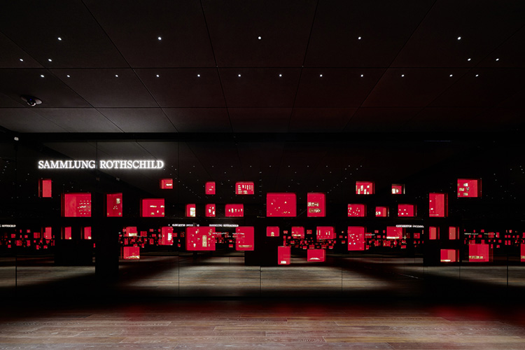 Ein raumhohes Sandwich aus 19 mm Panzerglas und Spion-Spiegelglas schützt die Vitrinen und stellte für die Lichtplaner eine große Herausforderung dar. Aufgrund der Dicke der Glasschicht und des hohen Absorptionsgrads mussten innerhalb der Vitrinen sehr hohe Leuchtdichten realisiert werden. In zahlreichen Versuchen und mit einem 1:1- Mock-up wurden mehrere Beleuchtungsprinzipien entwickelt und getestet. Die Lichtplaner zeigten auf, welche Materialien, Farben und Lichttypologien sich optimal für die Präsentation der Sammlung eigneten. Die Entscheidung fiel auf die folgenden Kombinationen aus Material und Licht: