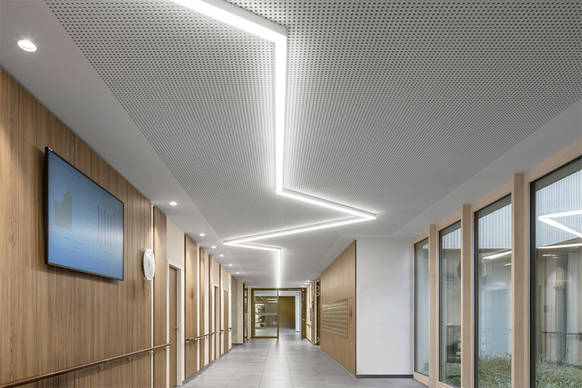 Die moderne Pflegeeinrichtung erstreckt sich über vier Geschosse und wurde in fünf Bauabschnitten realisiert. Die extravagante Besonderheit des durchgehenden LED-Lichtkanals in Form eines Herzschlags verläuft auf drei Stockwerken entlang der Hauptdurchgangswege. Jede Zickzack-Form wird individuell auf das jeweilige Stockwerk abgestimmt, um sich harmonisch in die Architektur einzufügen. Das Ergebnis ist eine Lichtführung, die zugleich für angenehme Helligkeit und klare Wege sorgt – indem sie gezielt auf Türen und Richtungen verweist.