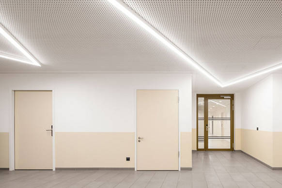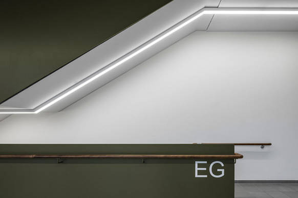 Treppenhäuser stellen besondere Anforderungen an die Lichtplanung – insbesondere in Pflegeeinrichtungen. Ältere Menschen oder Personen mit eingeschränkter Mobilität benötigen eine klare, kontrastreiche Ausleuchtung, um sich sicher bewegen zu können. LTS setzt hier auf den Lichtkanal 060, der mit gleichmäßiger, linearer Lichtverteilung die Stufen optimal aufhellt. Die Lichtführung reduziert Blendungen und Schatten, verbessert die Sichtverhältnisse und unterstützt die sichere Begehbarkeit. Gleichzeitig betonen die durchgehenden Lichtlinien die Geradlinigkeit der Architektur und setzen die Geländer visuell in Szene.