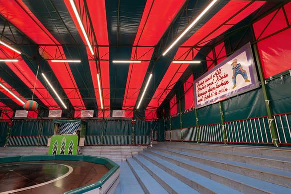 Ausgangspunkt war eine Anfrage der Betreiberin über die Lichtzentrale München, nachdem frühere Beleuchtungsversuche die TÜV-Anforderungen nicht erfüllten. Die Lichtbänder von Regiolux überzeugten durch ihre opale Abdeckung und die Möglichkeit, eine vollständig anpassbare Lösung zu konfigurieren. Innerhalb weniger Wochen entstand aus einem Standard-Lichtband eine speziell modifizierte Leuchte, die sich exakt an die Zeltstruktur anpassen ließ. Geräteträger, Stromversorgung und Verbindungselemente wurden individuell gefertigt. Die Umrüstung auf Schukostecker ermöglicht eine einfache Inbetriebnahme und Steuerung. Das ist besonders wichtig, da die Montage nicht durch Elektriker, sondern durch Zeltbauer erfolgt.