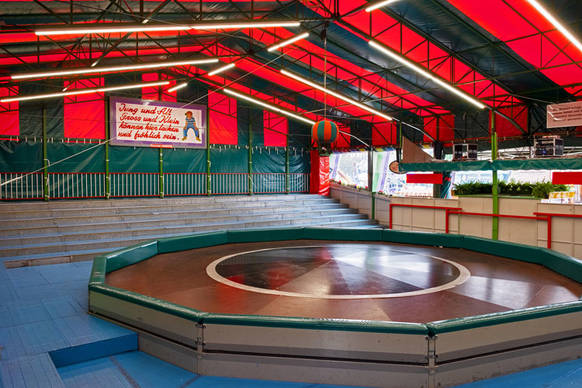 Das Projekt erforderte mehrere technische Sonderlösungen. Die Leuchten werden vor der Planenmontage installiert und sind daher strahlwassergeschützt (IP64). Ein drahtloses Dimm- und Steuersystem erlaubt die Anpassung der Lichtintensität an Tages- und Abendbetrieb und sorgt für eine energieeffiziente, zugleich stimmungsvolle Beleuchtung.