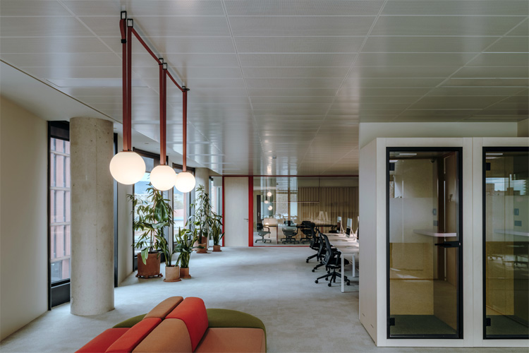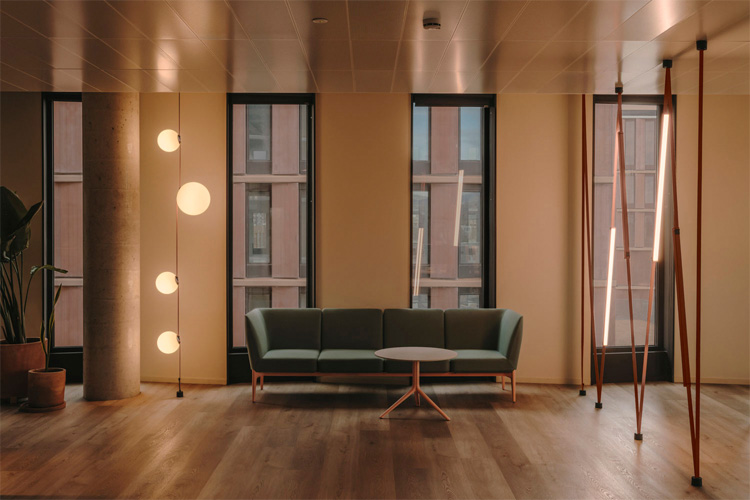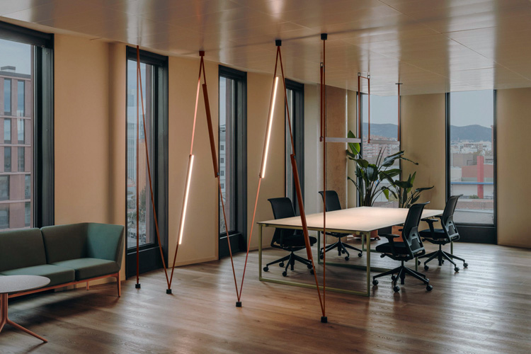 Die Vielseitigkeit des Beleuchtungssystems Plusminus aus der Feder von Diez Office fügt sich perfekt in diese Vielfalt an Umgebungen ein, mit seiner breiten Auswahl an verschiedenen Leuchten, die an jede Situation und jeden Bedarf angepasst werden können, und dem Textilband, das als Schlüsselelement fungiert. Die erste Variante schafft eine gelassenere und ruhigere Umgebung, die zur Konzentration einlädt, während die zweite Variante eine informellere Stimmung in den Bereichen entstehen lässt, die für gesellige Momente vorgesehen sind. Für Plusminus wurde in allen Fällen ein erdiger Farbton gewählt, passend zu einigen Möbelstücken und bestimmten Glasprofilen.